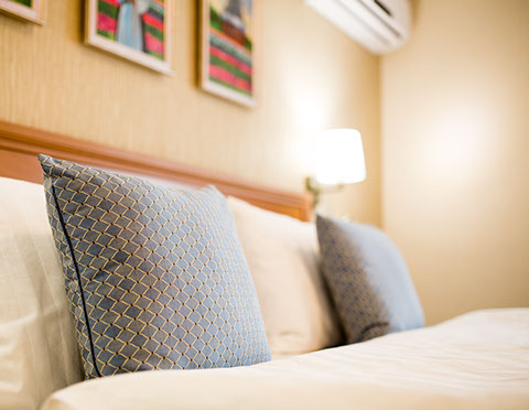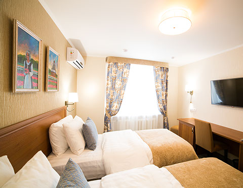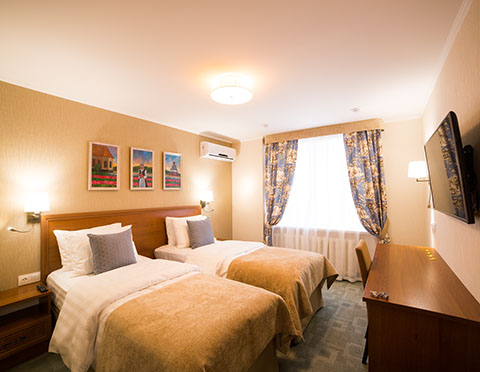 Номер может быть как с одной большой кроватью премиум класса King size (1,8*2), так и с двумя раздельными односпальными кроватями 0,9*2.